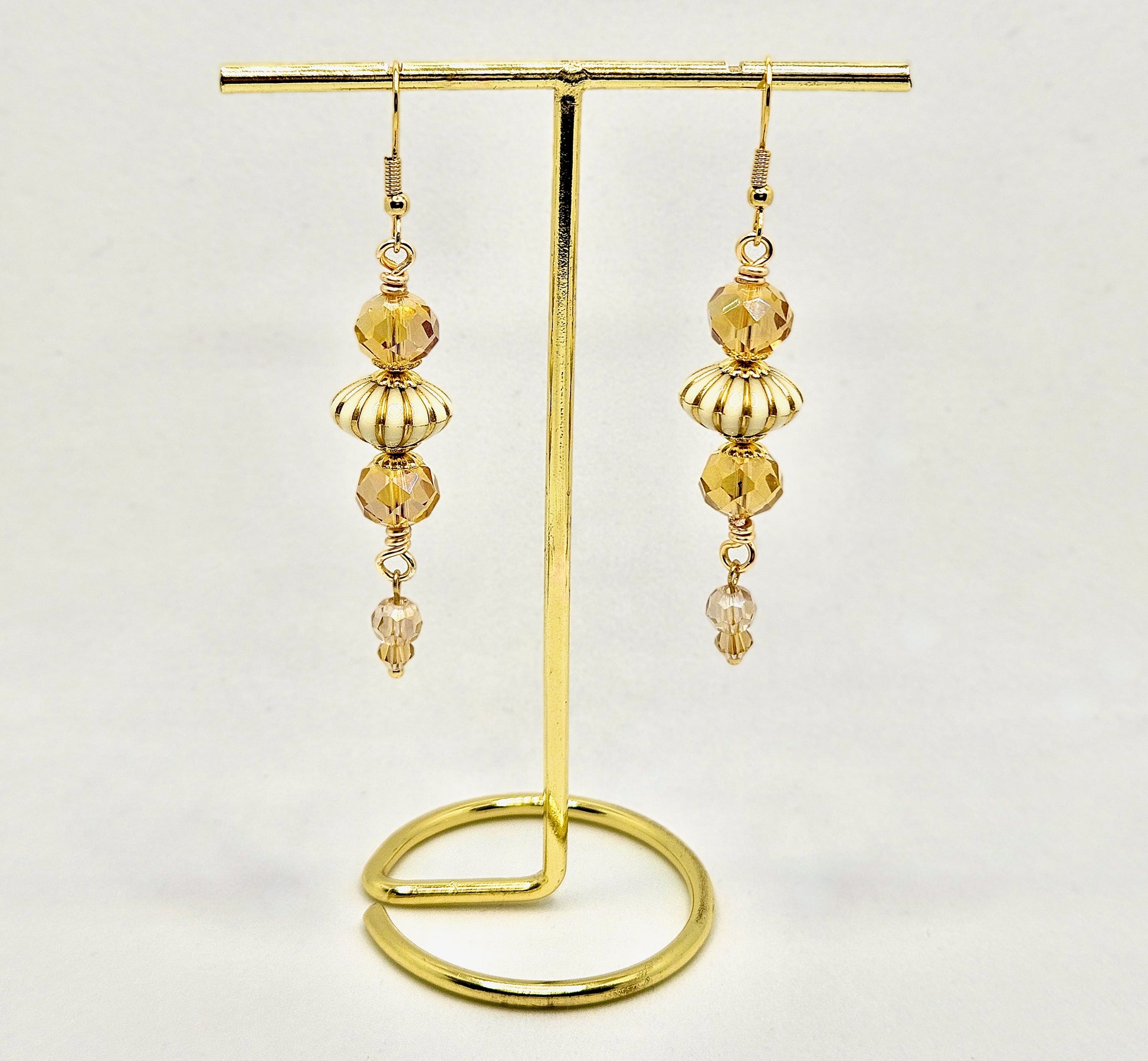 Catch the light and turn heads with these dazzling drop earrings. Crafted from gold-plated stainless steel wire and adorned with shimmering iridescent glass beads, they deliver serious sparkle with a playful edge. Perfect for anyone who loves a bit of glamorous shine.